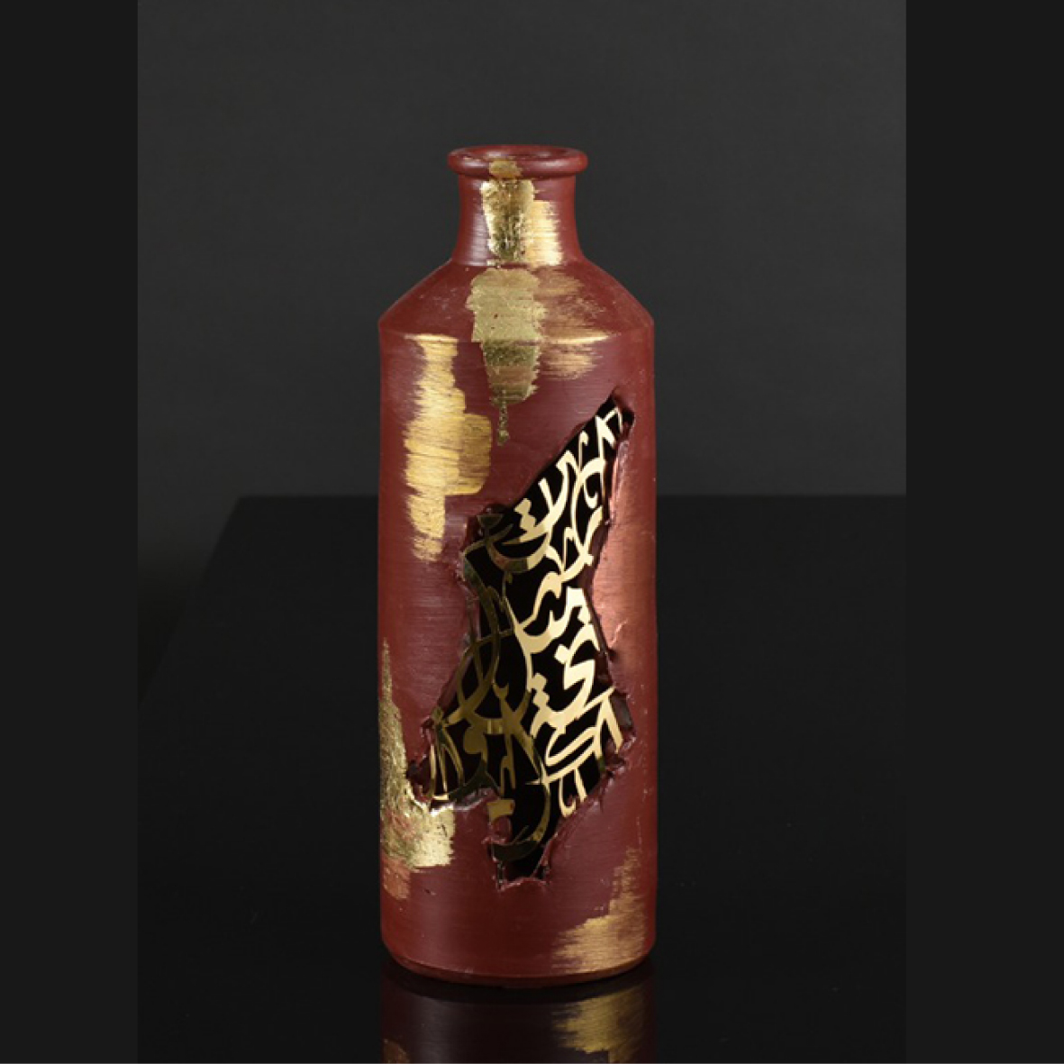 Bottle-style pottery vase with gold-plated metal calligraphy patch.