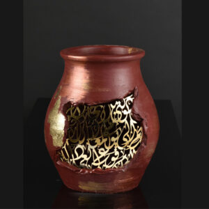 Bouquet-style pottery vase with gold-plated metal calligraphy patch.