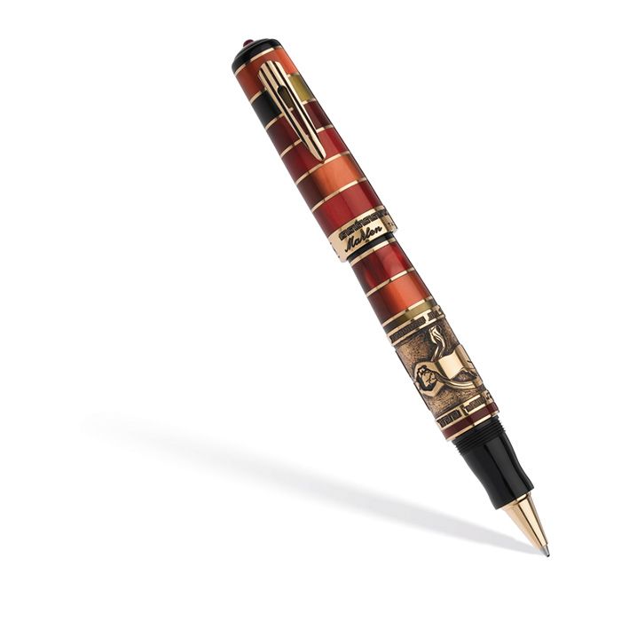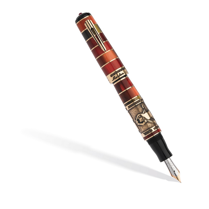 This limited edition represents a luxurious interpretation of the epic journey of the ancient city of Pompeii. The pen is built from large pearly resin bands in “Pompei Red” color. The large central ring of the barrel is a bronze low-relief work which depicts the famous “Bacchants” fresco, discovered inside the “Villa of Mistery”. The clip and the small rings have been crafted in brass; a cabochon ruby has been set at the top of the lid.